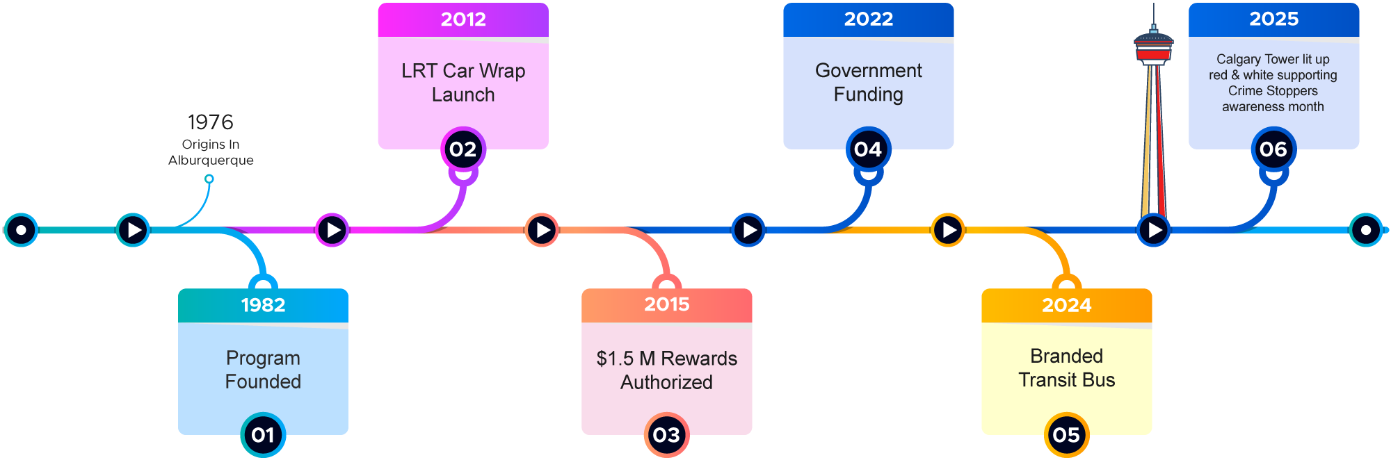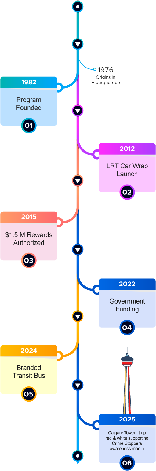 Since its founding in 1982 as Canada’s first Crime Stoppers program, Calgary Crime Stoppers has led the way in anonymous community-based crime prevention. From the early success of its tipline to innovative awareness efforts like the 2012 LRT car wrap, $1.5 million in rewards by 2015, and government funding support in 2022, the program continues to evolve. In recent years, high-visibility campaigns such as the 2024 branded transit bus and the 2025 Calgary Tower lighting in red and white have reinforced public trust and civic pridemarking over four decades of impact, awareness, and community partnership.